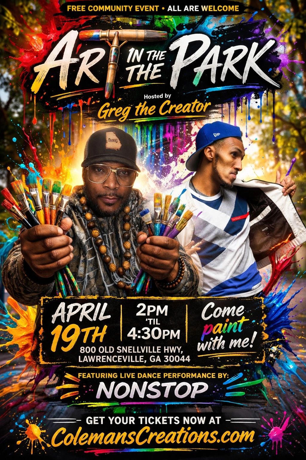 Join Greg the Creator for a fun, creative outdoor painting experience filled with good vibes and community energy.